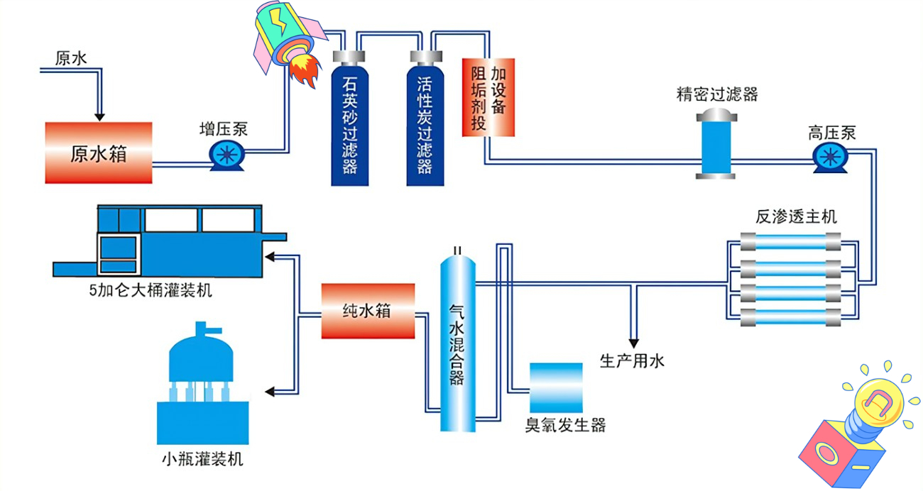一般包括原水泵、加药装置、石英砂过滤器、活性炭过滤器、树脂软化过滤器,精密过滤器等。